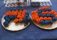 Photo of two plates of cupcakes, half with orange frosting and half with blue frosting, spelling out "75" on two round plates. Some of the cupcakes have been eaten.