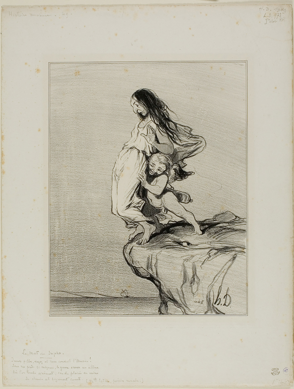 A nineteenth century portrait by the French artist Honoré Daumier (1808-1879) depicts a caricature of Sappho being pushed to the edge of the Leucadian cliffs by a sinister-looking cupid. In “Sappho’s Death,” the poet is conspicuously “dark,” her hair bedraggled, her nose meant to evoke anti-Semitic stereotypes. Originally published in the illustrated magazine Le Charivari, a French precursor to the English magazine Punch, the series was also meant to be more humorous and less political. We might therefore ask, what exactly is funny about suicide and racial anxiety? In contrast, the British painter Simeon Solomon (1840-1905) shows Sappho in a more classically traditional style, with laurels in her hair and her lyre sitting nearby, in Sappho and Erinna in a Garden at Mytilene. In this image, the poet has dark hair and olive skin; scholars have debated the model for the painting, though it is highly likely that it was Keomi (Keytumus Bonnett née Gray, 1841-1914). Keomi was a model popular with the Pre-Raphaelite Brotherhood, figuring heavily in the paintings of Solomon, her lover Frederick Sandys (1829-1904), and of the Rossettis. Of Romany descent, she was often depicted as various mythological Greek figures including Cassandra and Medea. Extant drawings by Solomon experiment with the composition for the painting, including a draft in which Sappho looks on longingly at Erinna with a male companion. The portrayals arguably explore a spectrum of same-sex desire, from hidden longing to an actual embrace; queerness was a common theme in his work, sometimes subtle and often not.