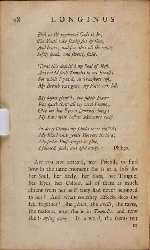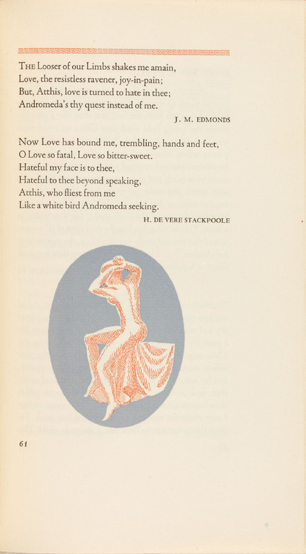 Ancient sources state that Sappho’s lyrics encompassed nine volumes, of which some 650 lines and precisely one complete poem survives. Composed around the time early writing systems were being developed, it is likely her lyrics were not written down for more than a century after her death. Surviving material comes primarily from quotations in classical works by other authors. For example, the poem known as Fragment 31 was excerpted in the work of Longinus (1st century CE) in his treatise on aesthetics On the Sublime. “Sappho… always chooses the emotions associated with love’s madness from the attendant circumstances and the real situation,” he wrote. Longinus’s text analyzed the works of several dozen authors from the ancient world; he commented on Homer, various other Greek authors, and, intriguingly for the time, on the Book of Genesis. Placing Sappho’s lyrics alongside epic verse and Hebrew poetry, Longinus invites the reader to consider what makes great works truly great. By the twentieth century, editions of Sappho took on a variety of forms, from the scholarly to the salacious. The Songs of Sappho in English Translation by Many Poets, published by Peter Pauper Press in 1942 as a finely printed “gift book” for the American market, presents various versions of each poem by well-known translators. In this format even the casual reader can admire how single word choices can alter the mood or meaning of each poem. In retrospect, this presentation is all the more interesting given that such works were being avidly collected in the United States and banned as amoral in Nazi Germany and Soviet Russia. Songs appears as a quasi harbinger of the Cold War as it would soon take place in books.